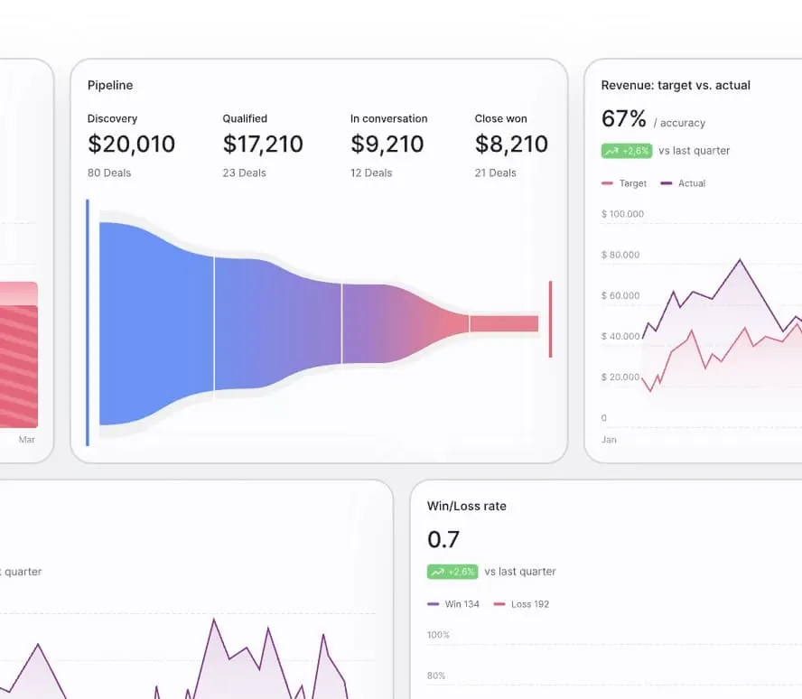 Qelaris provides real-time dashboards tracking KPIs such as conversion rates, lead response times, and pipeline velocity. Custom reports can be filtered by team, region, or product, and drill-down analytics allow inspection of individual rep performance or deal histories. Data can be exported as PDFs, Excel files, or shared via Slack/email alerts. Dashboards are customizable for executive-level summaries or granular manager insights.